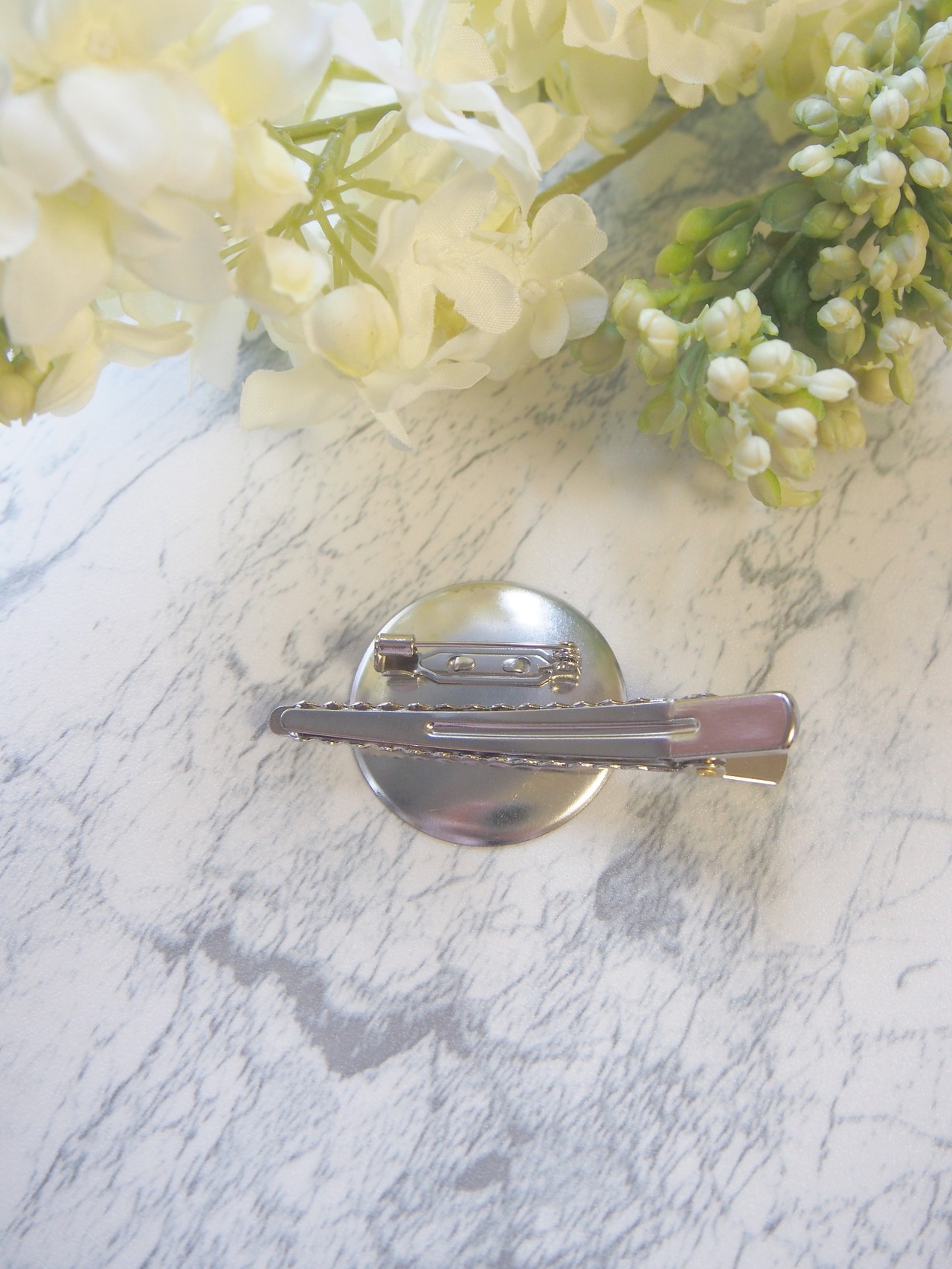 裏面には「ピン」と「クリップ」が付いており、装着する場所によって使い方を変えられます。お洋服やバッグに取り付けて、装いのアクセントとして幅広くお楽しみください。
